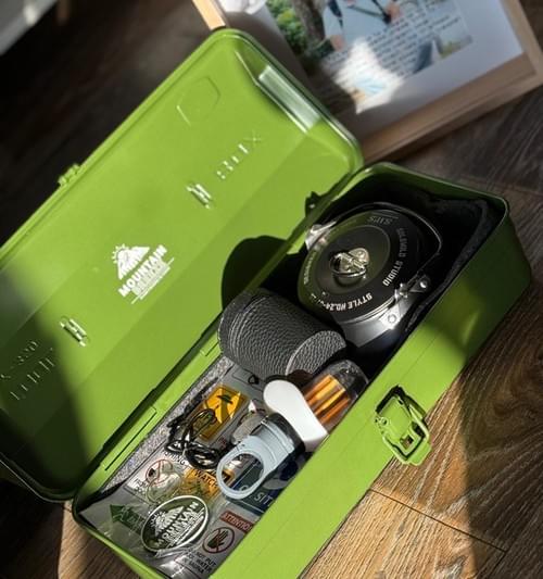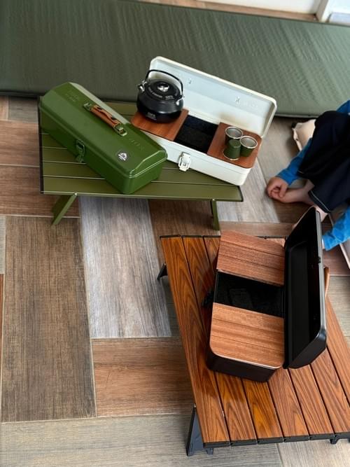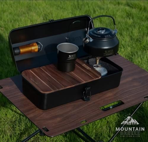Unique coffee box, available in tbree colors , metal box,light,4 cups,coffee pot, 2 wooden plats, soft bottom.
