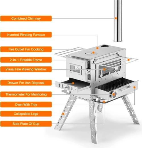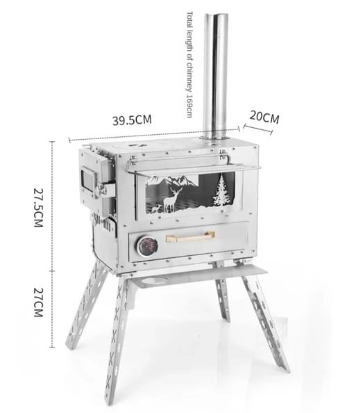 The wood stove is a fantastic stove and it is a must for camping in the cold weather , it is suitble for tents and Caravans , the stove comes with the whole equipment for easy and fast installation .it is also have a grill with thermometer, It will guarantee you feel like home.